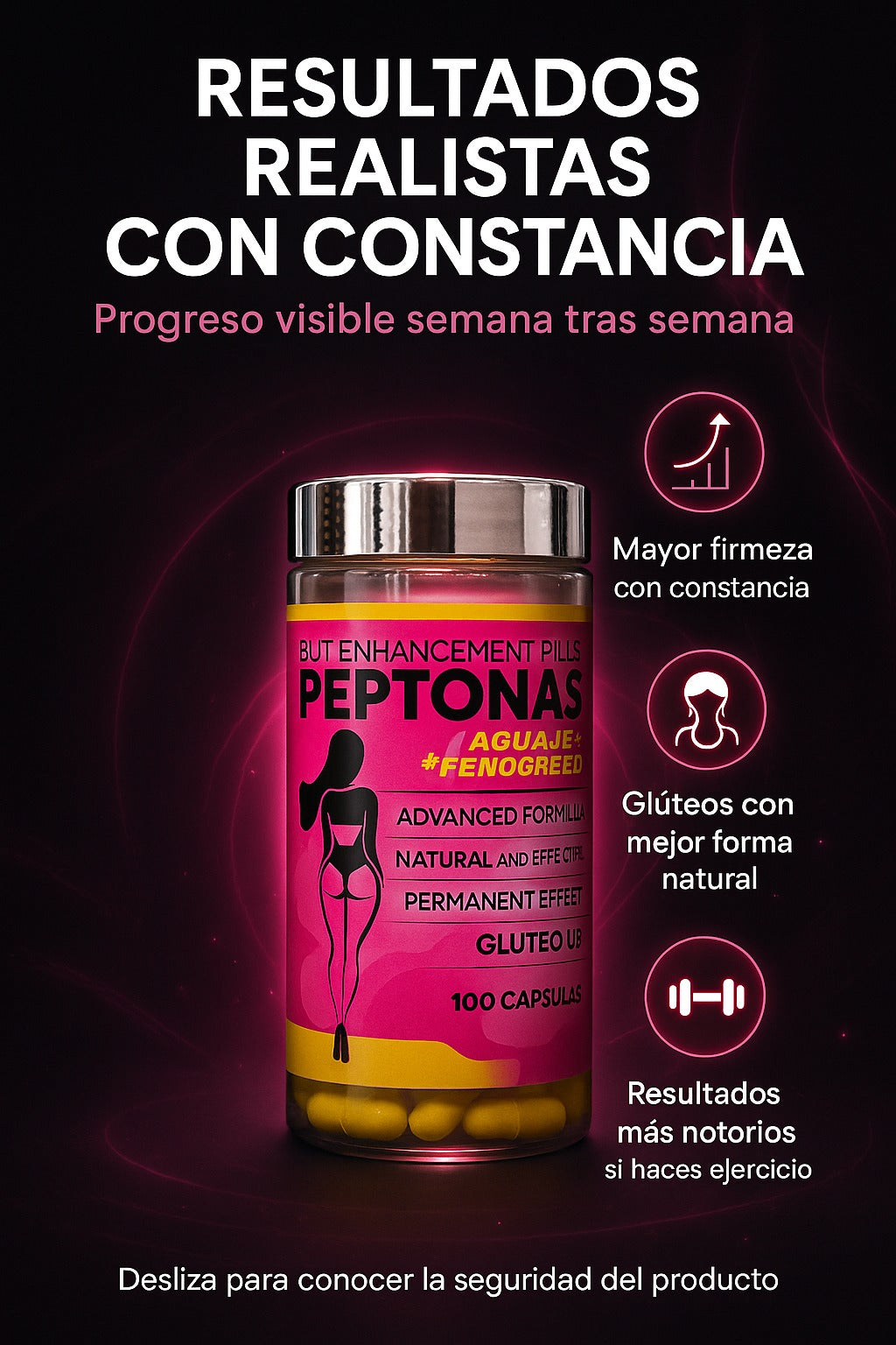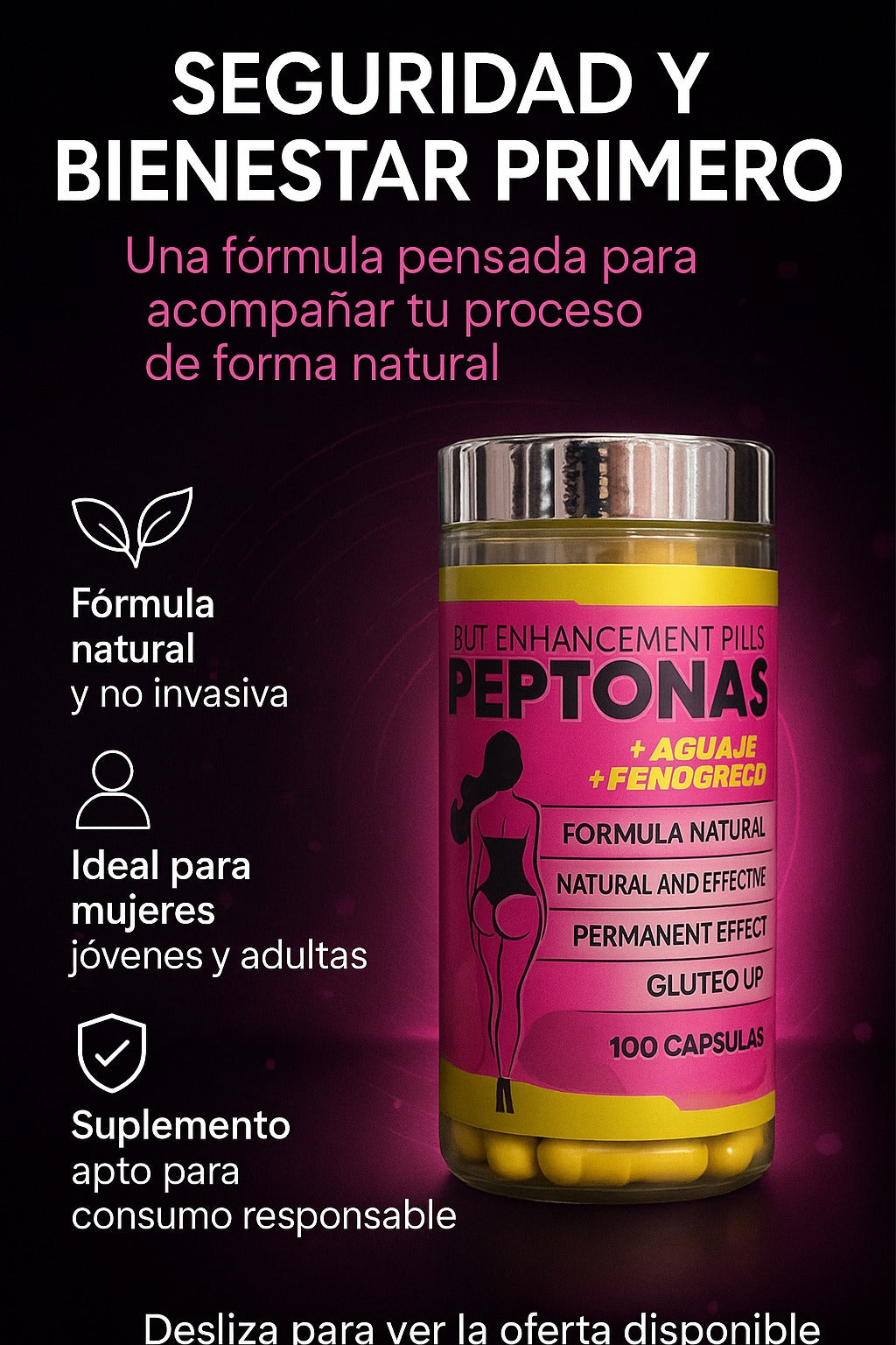 GluteUp Pro – Peptonas es una opción natural y práctica para las mujeres que desean mejorar su bienestar y tonificación sin recurrir a métodos invasivos o procedimientos complejos. Su fórmula en cápsulas te permite avanzar de forma segura, gradual y responsable, apoyando tus esfuerzos diarios sin poner en riesgo tu salud ni tu tranquilidad. Es la elección ideal para quienes prefieren resultados basados en constancia y hábitos saludables.