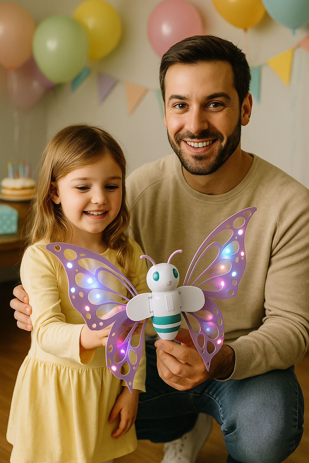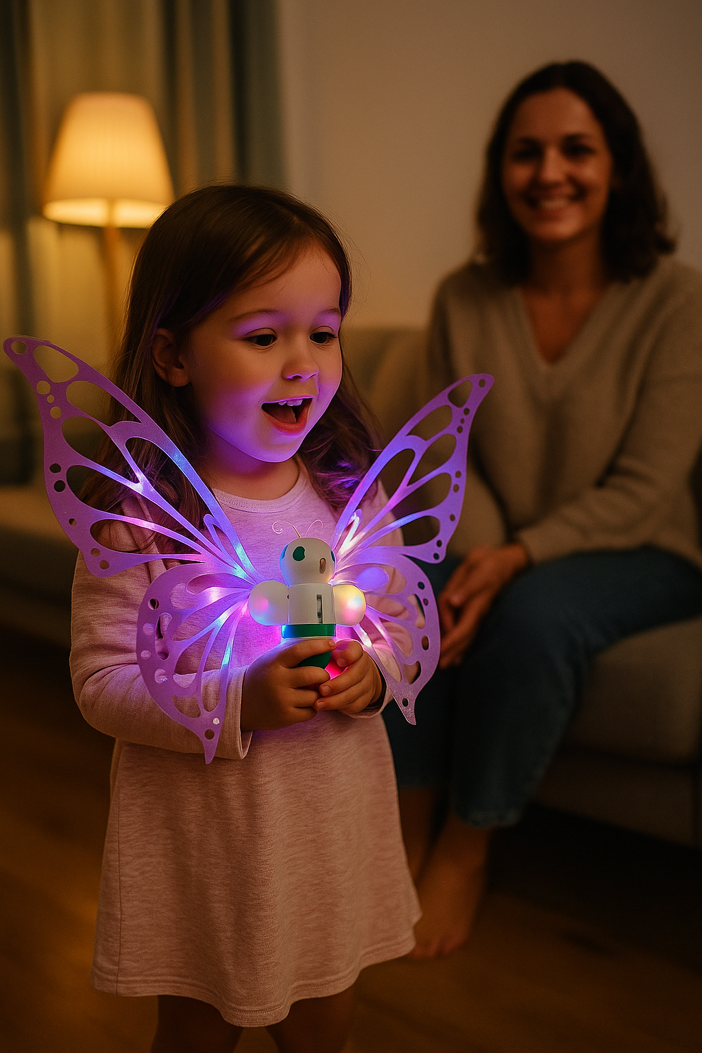 Solo coloca las alas con el cinturón ajustable, enciende el botón y observa cómo cobran vida con movimiento y luz.
